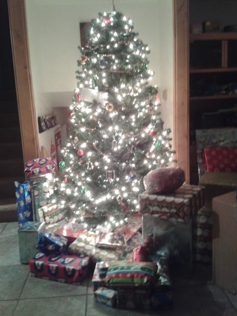 This piece of 2'x4' mdf is our Christmas tree this year. We have too many family members that need a place to sit this year, so we can't put a chair out in the garage this year to make room for the Christmas tree. I found this huge tree sticker in my box of leftover stuff so I glued it on the board. Brady drilled 100 holes in this board for a string of lights to fit through. I tied a green garland around the edge, and we hung some of the non-breakable ornaments we had on the lights. It's definitely not the fanciest thing out there, but it fits in our house, Rydon and Ayla can't play with and eat the ornaments, and we still have enough room for our family to sit and watch Christmas movies together. I am really hoping that next year we have a house big enough for an 8 foot tall tree. Because we have given each child an ornament every year since they were born (and I buy at least one for me every year as well), we certainly have enough ornaments to decorate a tree that big!